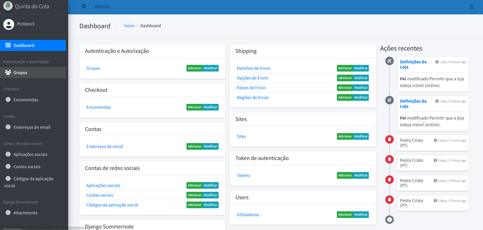 Na imagem abaixo pode ver todos os módulos criados para a construção da base de dados do website.