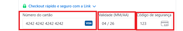 Nota: Em modo de teste, pode simular compras sem custos. Use qualquer data de expiração futura (ex.: 12/34) e qualquer CVC (ex.: 123).