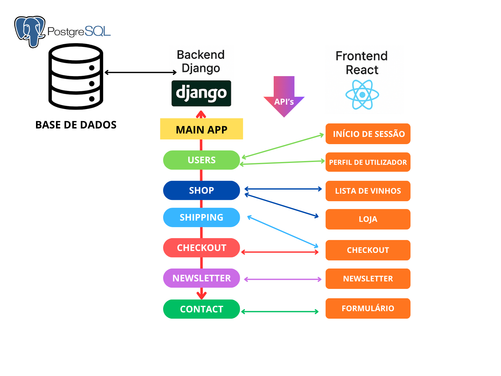 Na imagem abaixo é possível visualizar todos os módulos criados para a construção da base de dados do website, bem como a forma como o Backend (Django) comunica com o Frontend (React) através de REST APIs.